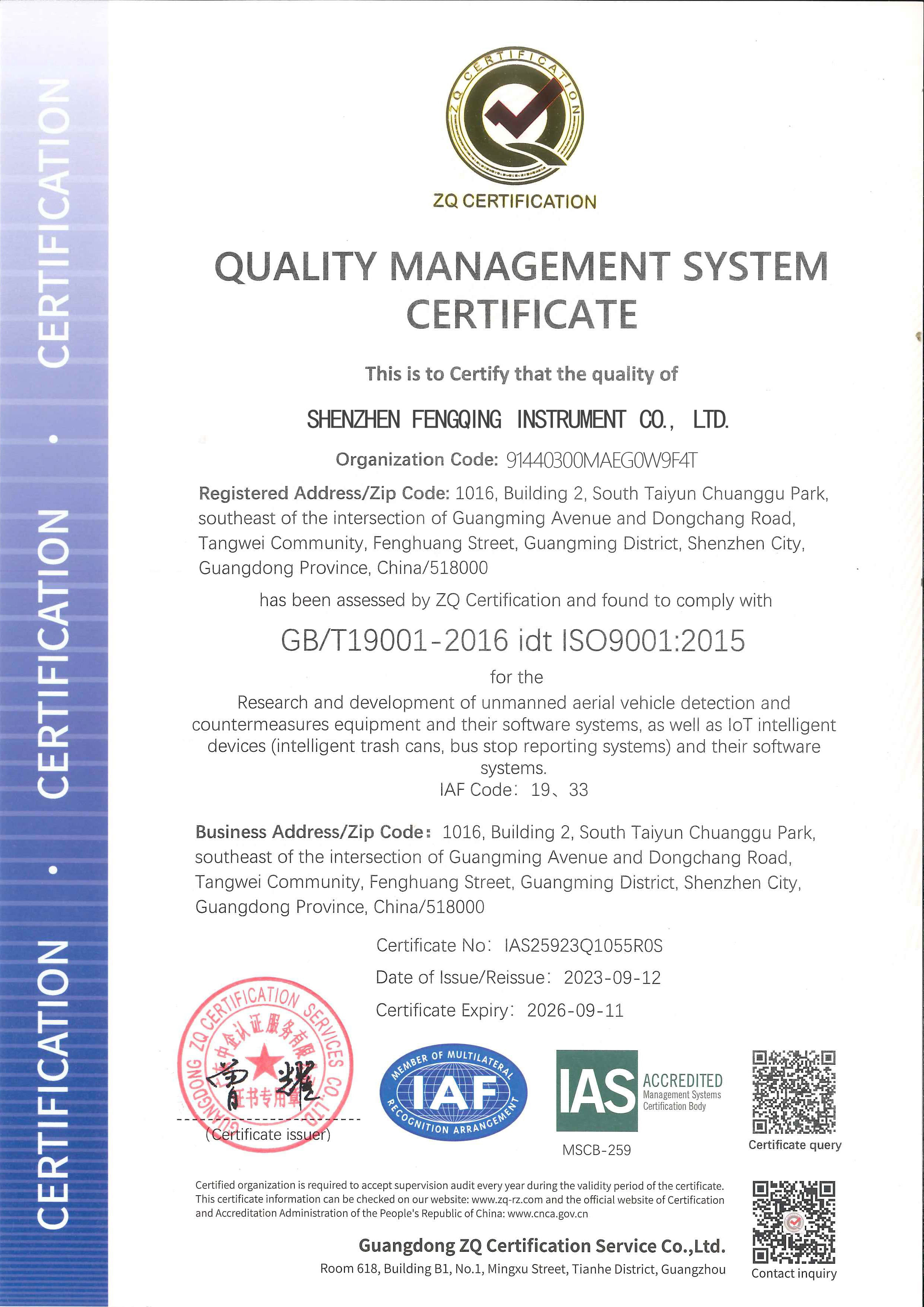 We strictly implement the ISO9001 quality management system, set up an independent quality inspection department, and are equipped with 2 full-time quality inspectors and a complete set of equipment including RF performance testers, environmental test chambers, and vibration test benches. The quality inspection process covers incoming raw material inspection, in-production patrol inspection, full-function testing of finished products, and aging tests, ensuring that each piece of equipment meets customer standards and industry specifications in terms of frequency accuracy, transmission power, and environmental adaptability. The company has obtained ISO9001 certification, making every effort to ensure product reliability.
